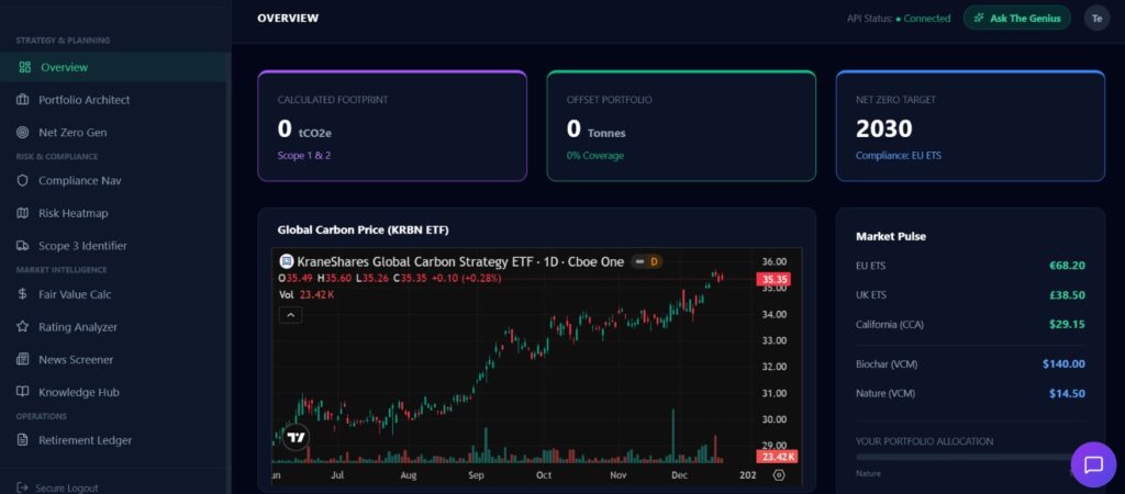 CRBN.credit brings together market analysis, carbon price forecasting, regulatory context, and AI-assisted strategy tools within a single platform. Rather than operating as a transactional marketplace, the system focuses on intelligence and research, offering users tools to assess market structure, price signals, credit quality, and long-term regulatory trends.